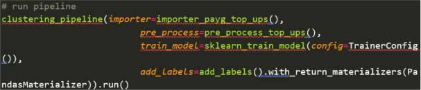 In less than an hour, the team was able to put together a working pipeline, using the ZenML functional API, that looked something like this:
