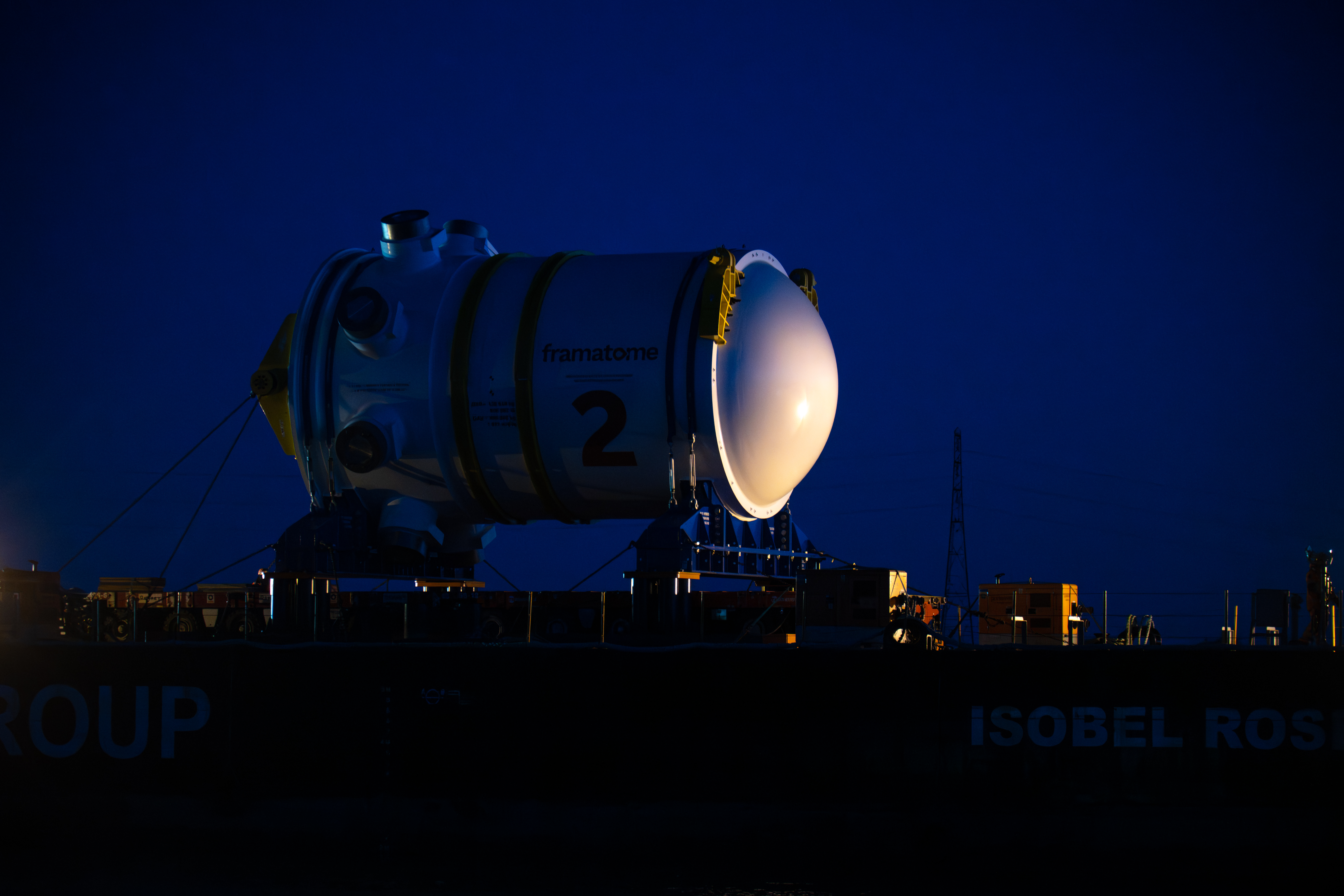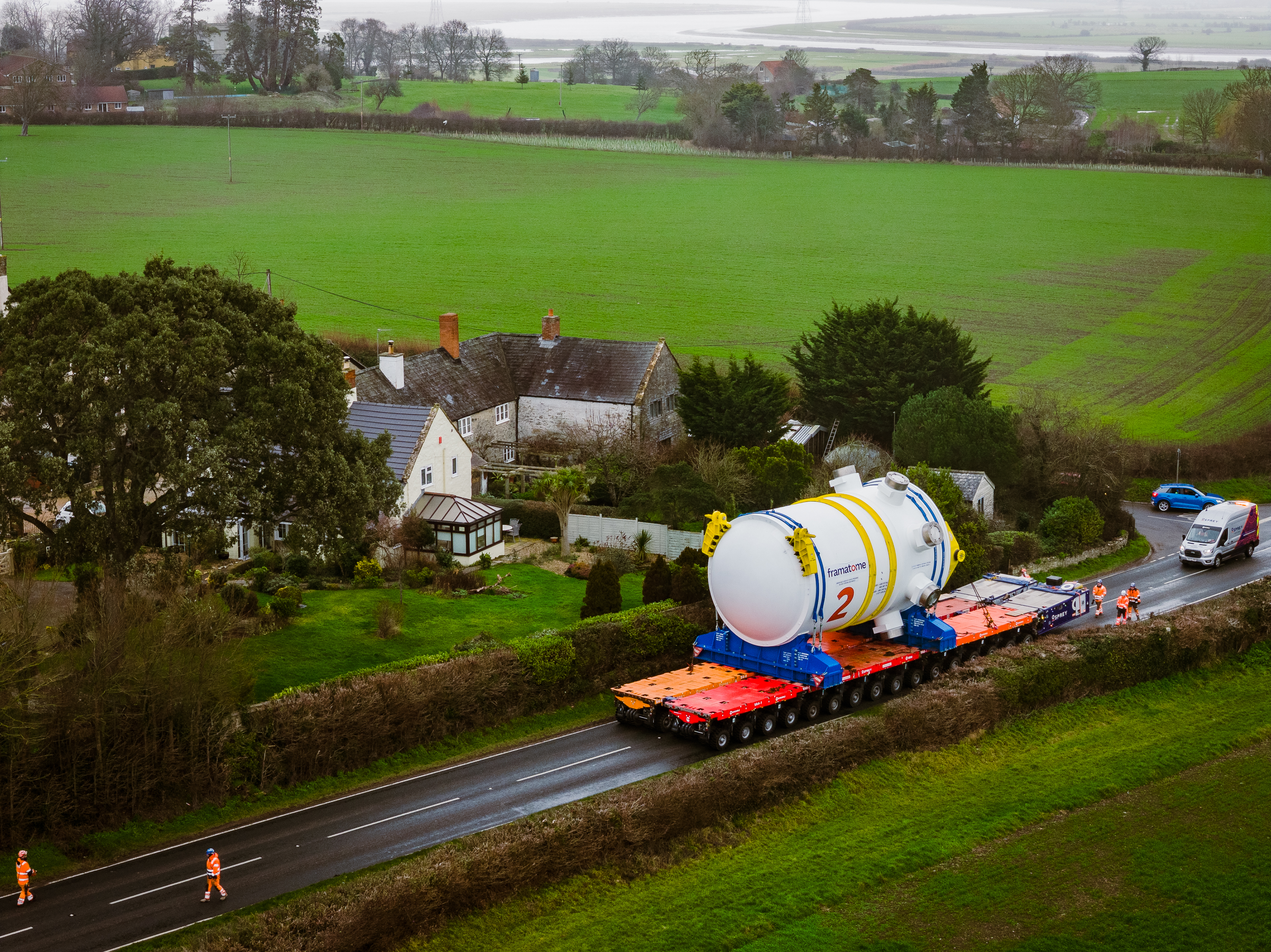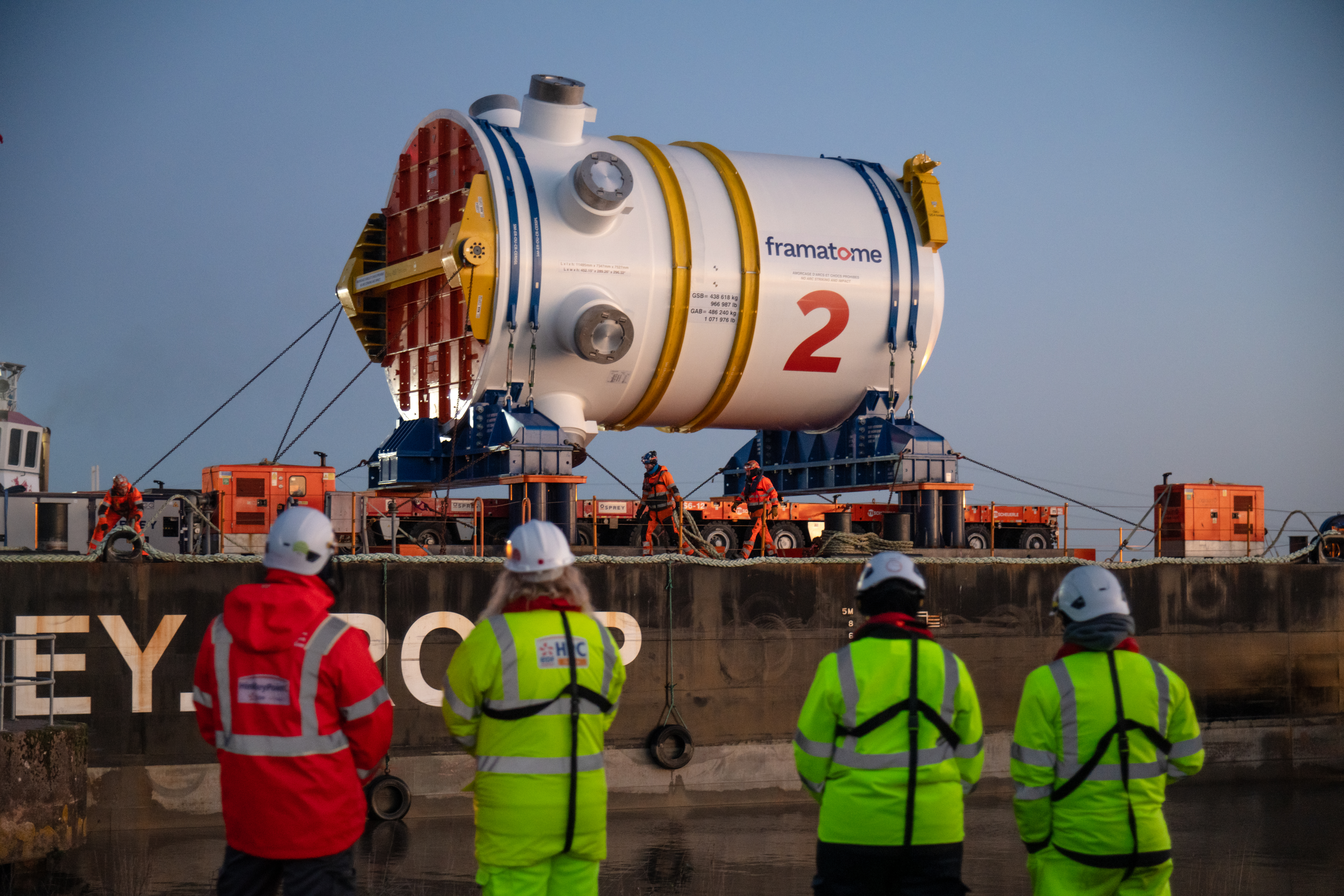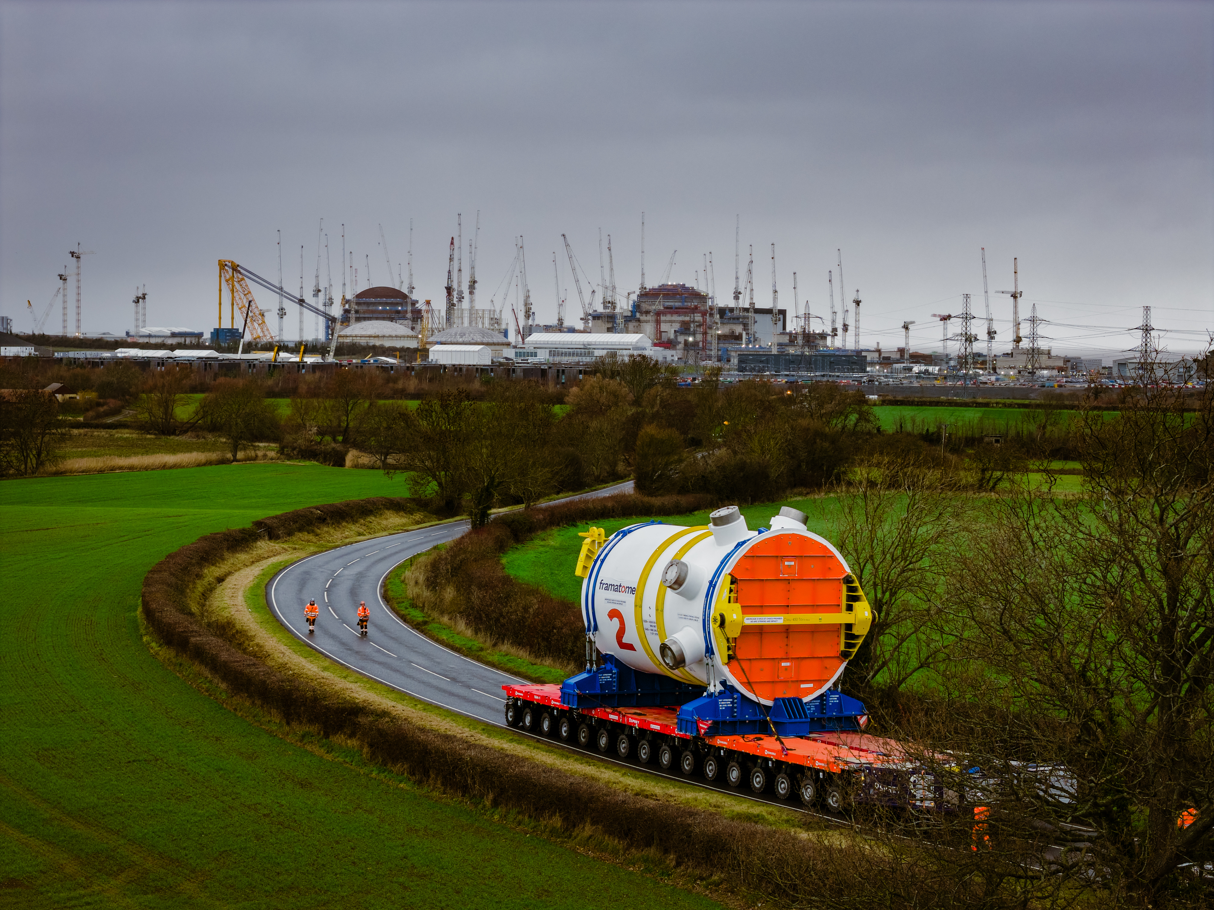 The reactor was shipped from the Framatome Saint Marcel factory in France to Avonmouth Docks in Bristol, before being transported by barge to Combwich Wharf on the River Parrett in Somerset. The final journey was a six hour road trip for four miles by a transporter to the construction site.
