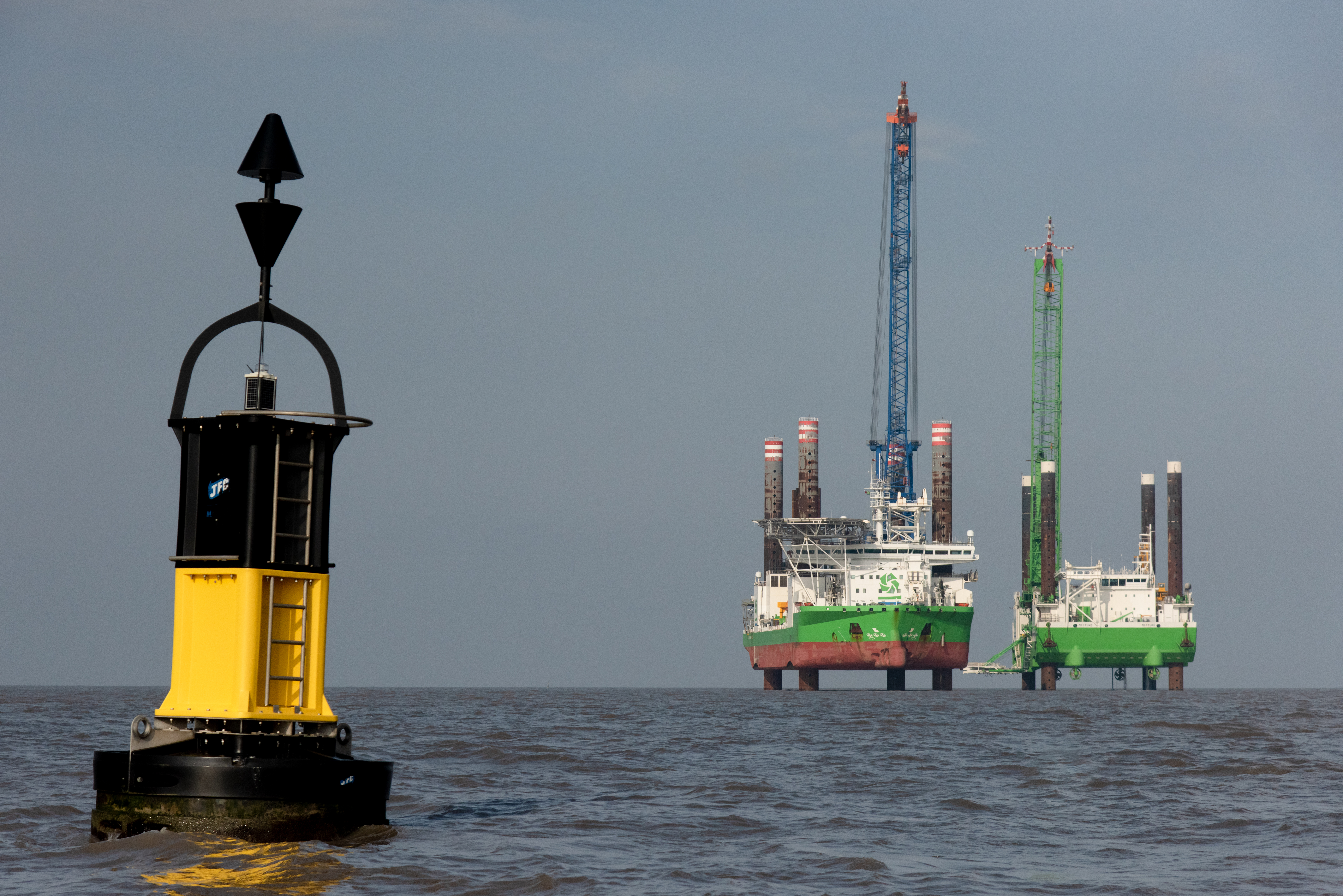Two huge jack up vessels arrived off the coast of Hinkley Point C as our Project’s offshore work moves into its final phase. The vessels, “Neptune” and “Sea Challenger”, will be used to connect the cooling water tunnels to the Heads on the seabed.