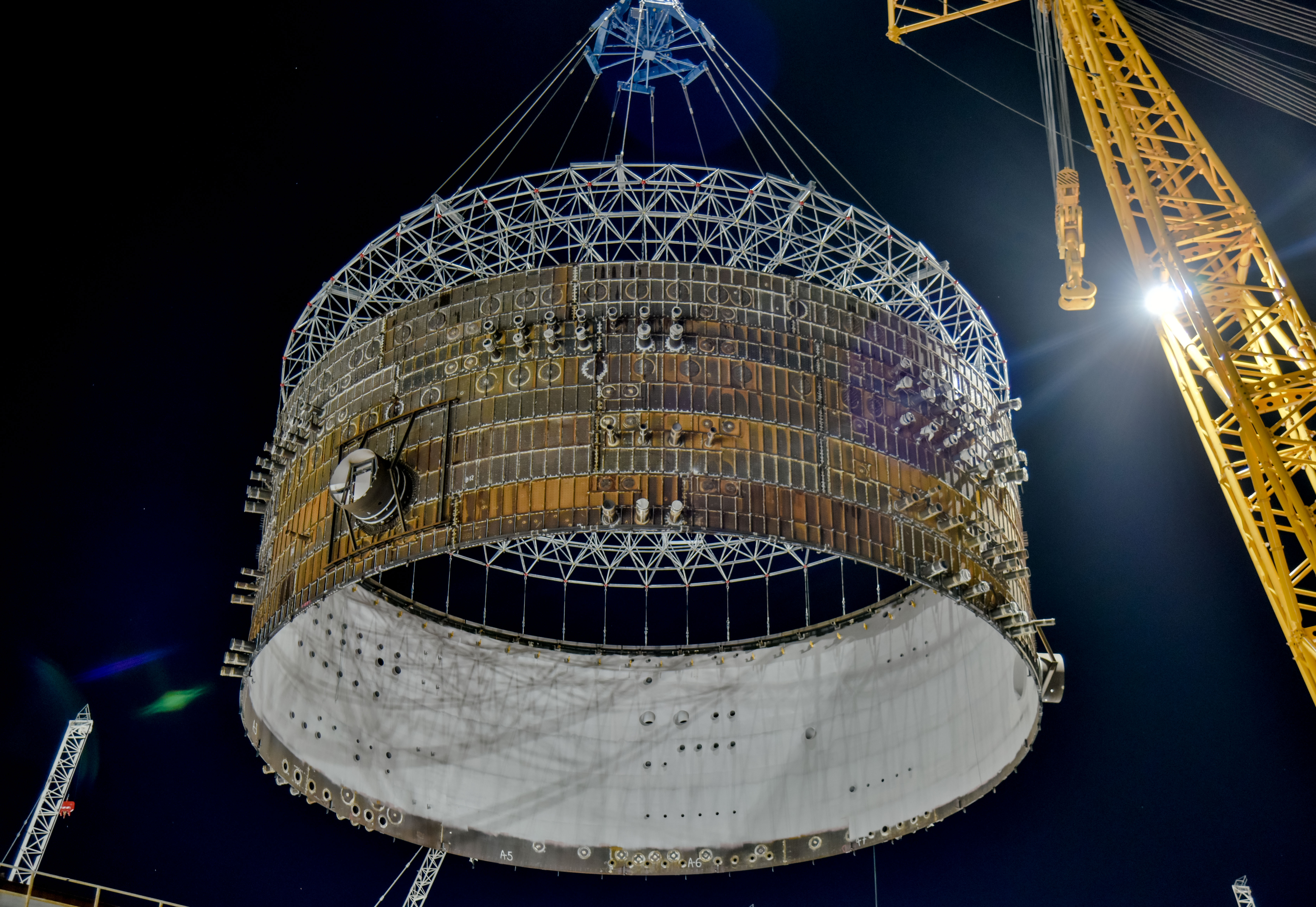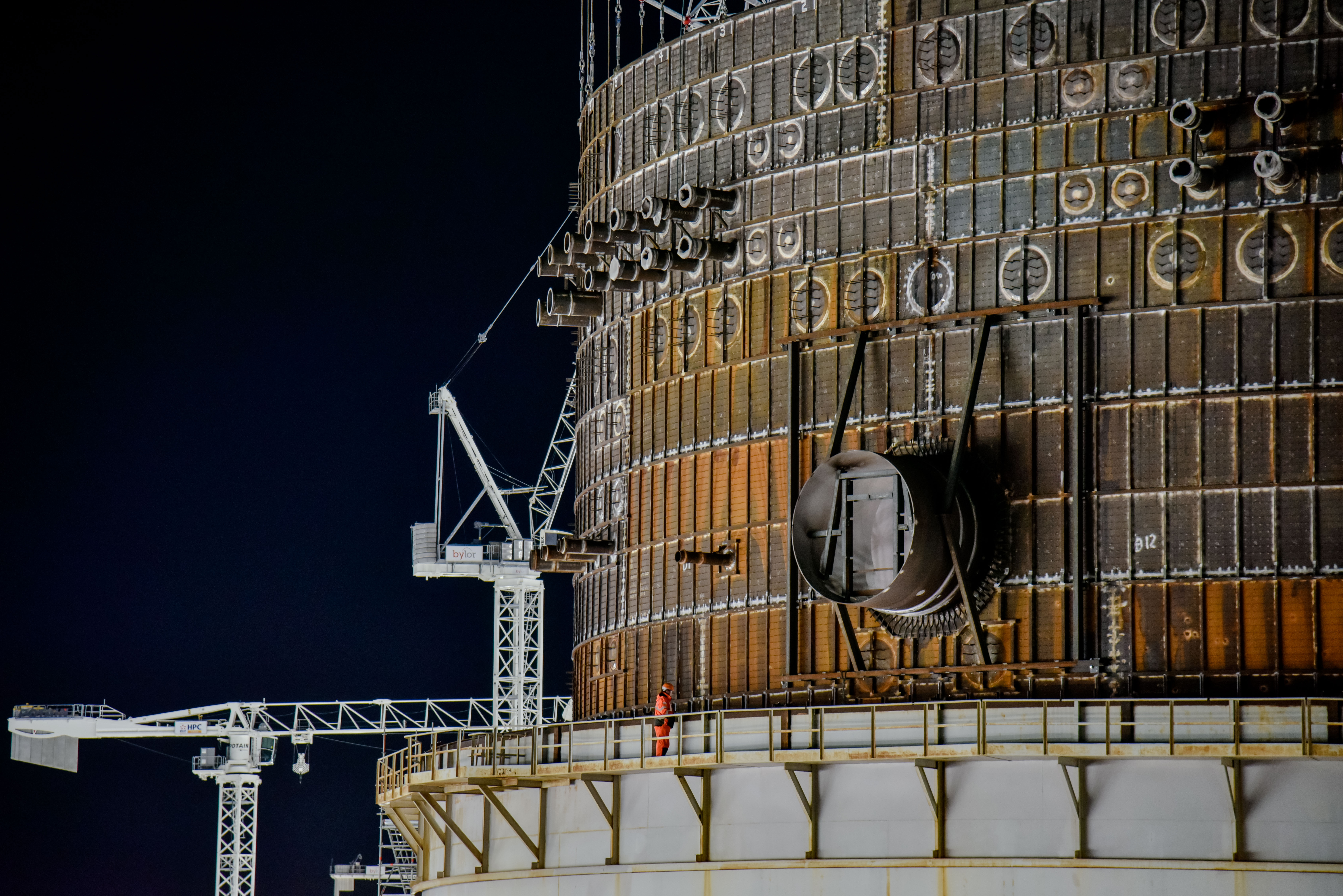The 17m tall ring with a diameter of 47m – was lifted out of a bunker where it was constructed in factory conditions – one of the innovations to improve quality on the project. Big Carl reached out 160m to put it in place during a night lift – timed to take advantage of lighter winds during a four-day operation.